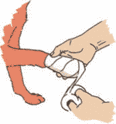 Bei Verletzungen und stark blutenden Wunden ist es sinnvoll, für den Transport zum Tierarzt einen Verband anzulegen. Achten Sie aber bitte darauf, dass dieser nicht zu fest sitzt. Eine Ausnahme sind pulsierende hellrote Blutungen, bei denen ein arterielles Gefäß eröffnet ist und starke Blutverluste drohen. Dieses sollte direkt über der Blutung abgebunden oder mit einem Stapel sauberer Taschentücher oder steriler Gazetupfer abgedrückt werden.
